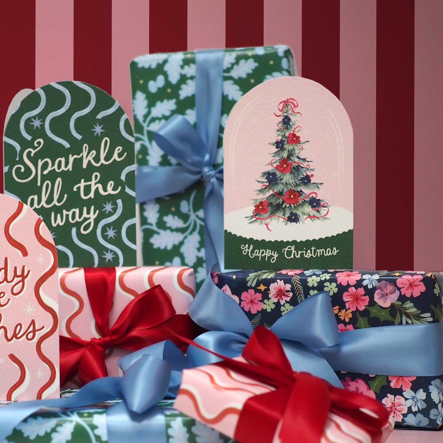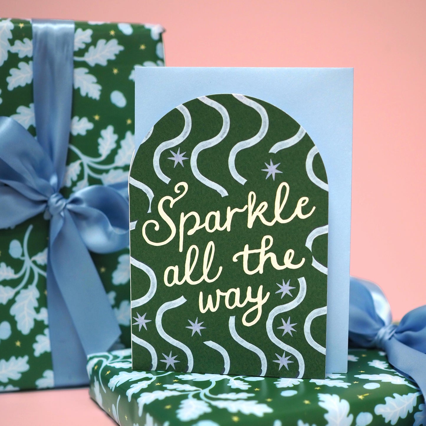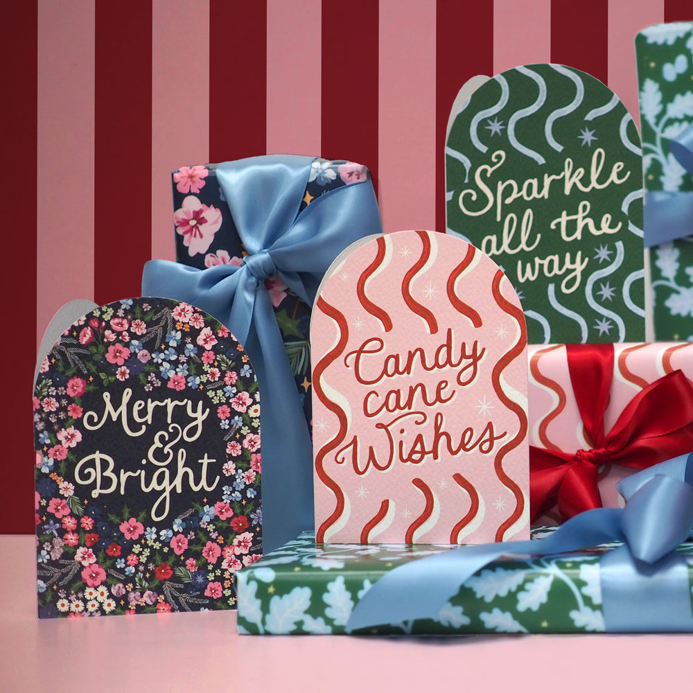 Say hello to Acorn Oak gift wrap. Featuring bright blue oak leaves and acorns scattered across a cheerful green background, sprinkled with twinkling hand-drawn stars, this gift wrap is full of festive charm and whimsy. Perfect for mixing and matching with our floral Hollyhock prints or wavy candy cane stripes, it’s a joyful way to make your gifts feel extra special this Christmas.
