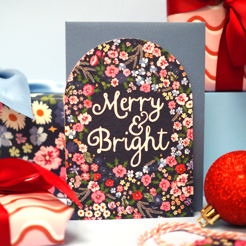 MERRY AND BRIGHT HOLLYHOCK CHRISTMAS CARD