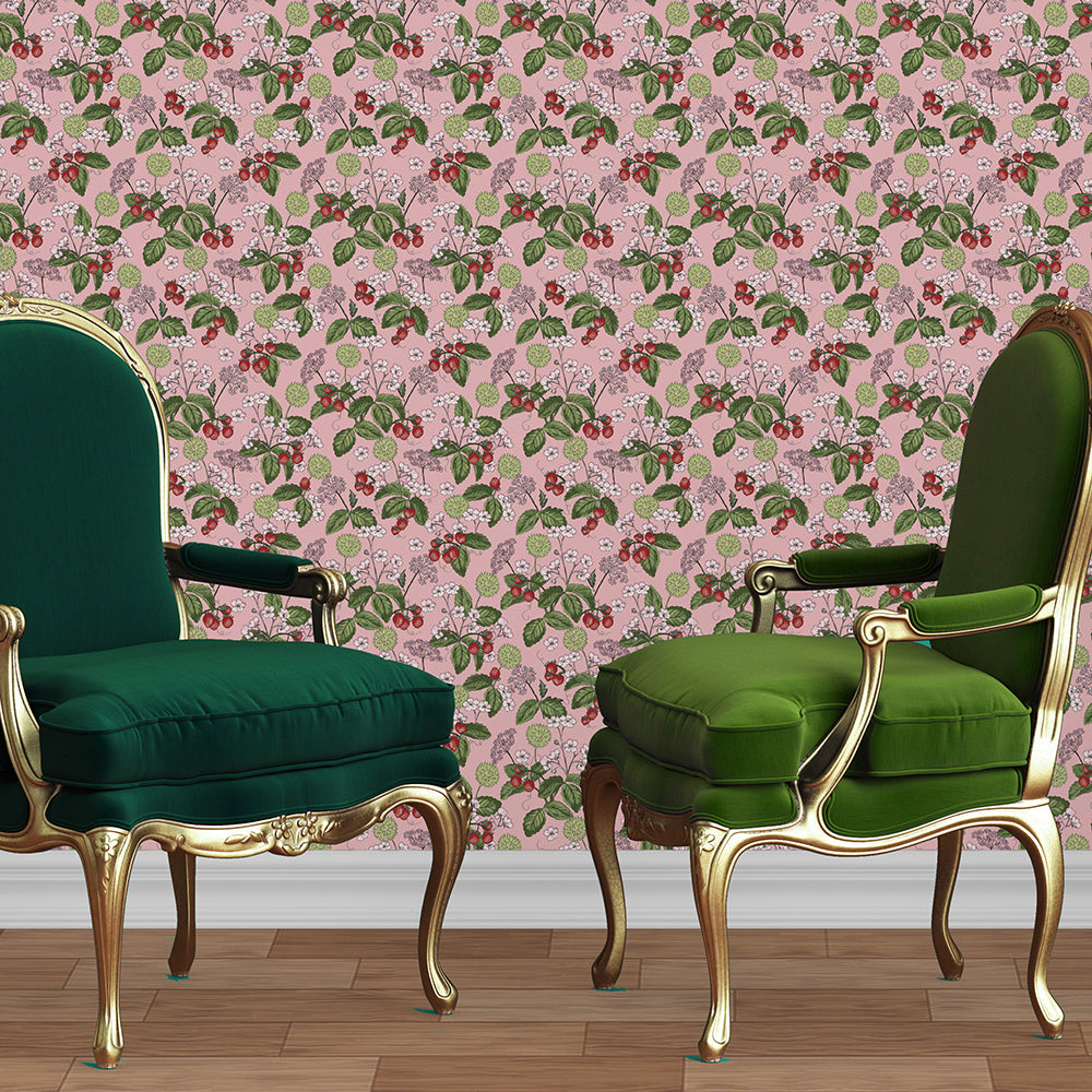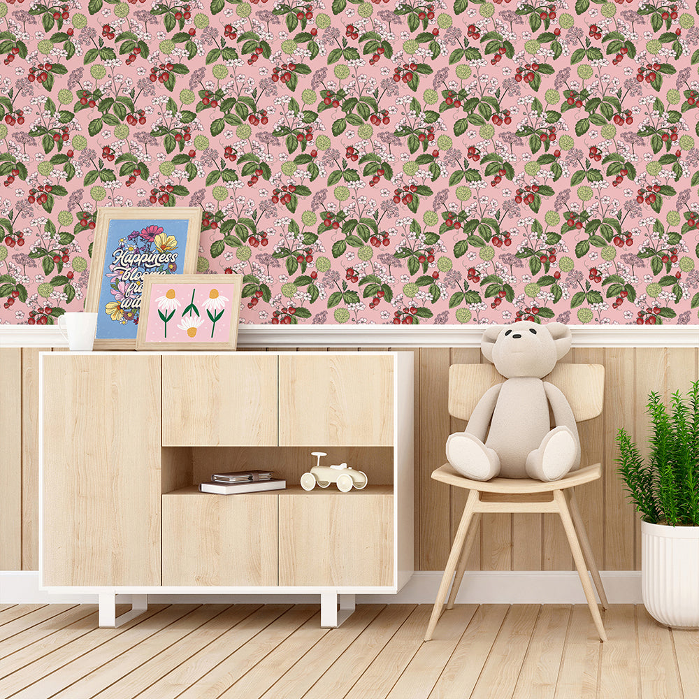Woodland Strawberry Pink Dollhouse Wallpaper