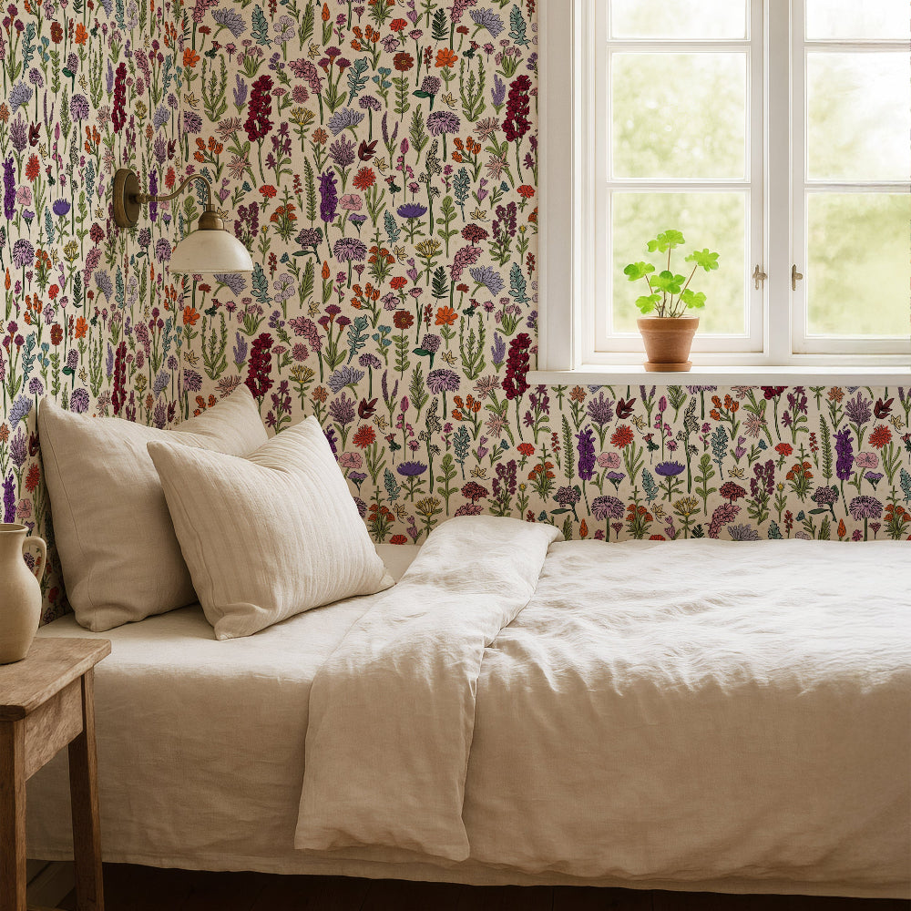 Alchemist's Meadow Sketched Floral Wallpaper - This hand-drawn design is filled with wildflowers in rich jewel tones, inspired by folklore, woodland apothecaries, and enchanted gardens. Perfect for creating a cosy, cottagecore atmosphere, this floral wallpaper is ideal for kitchens, bedrooms, or creative spaces that need a touch of charm and colour.