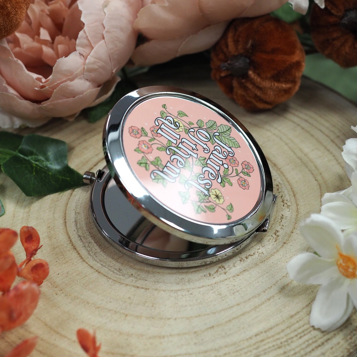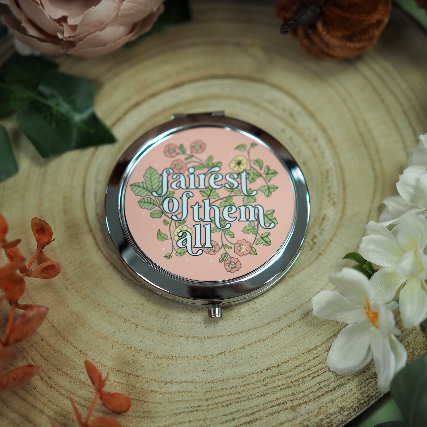Because life can be your own fairy tale - our 'Fairest of them all' compact mirror is adorned with hand drawn flowers and leaves.
