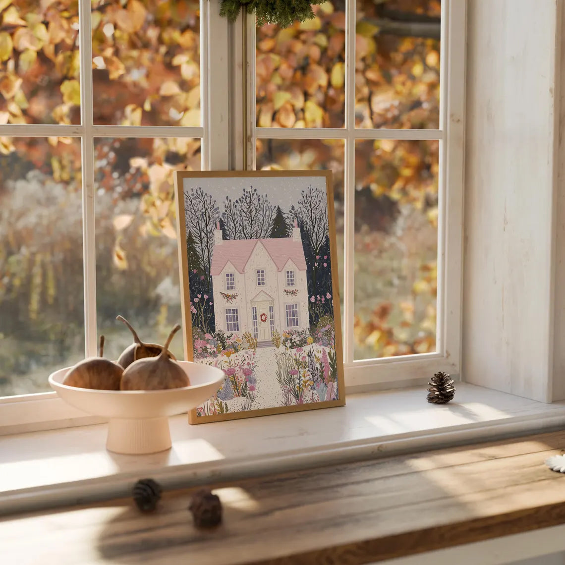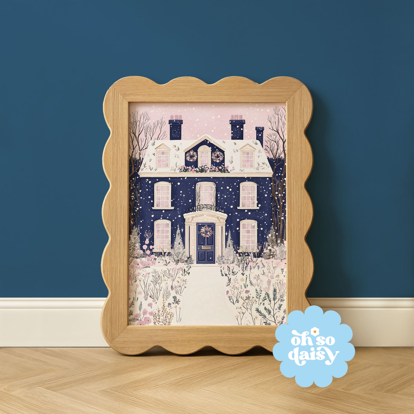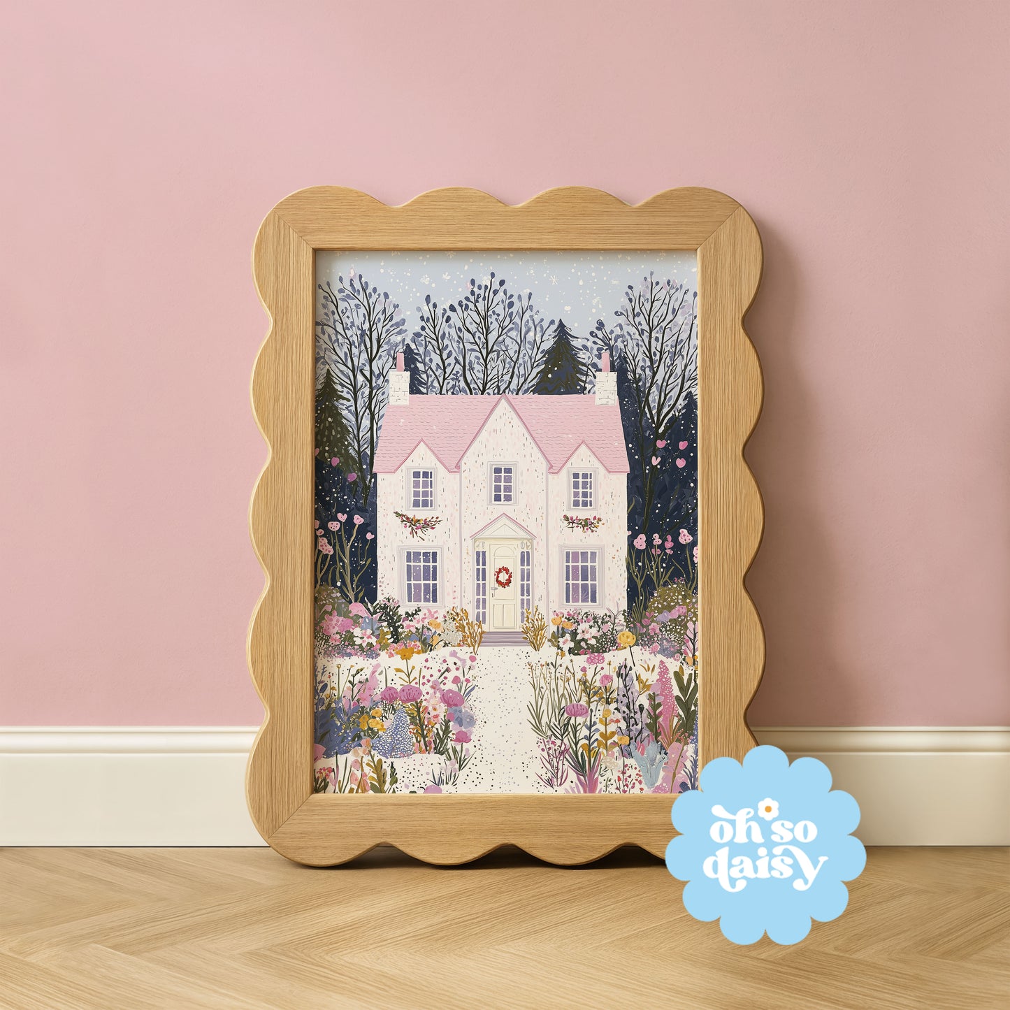Decorative framed artwork with a house and ghost design on a pink wall, featuring 'oh so daisy' brand.