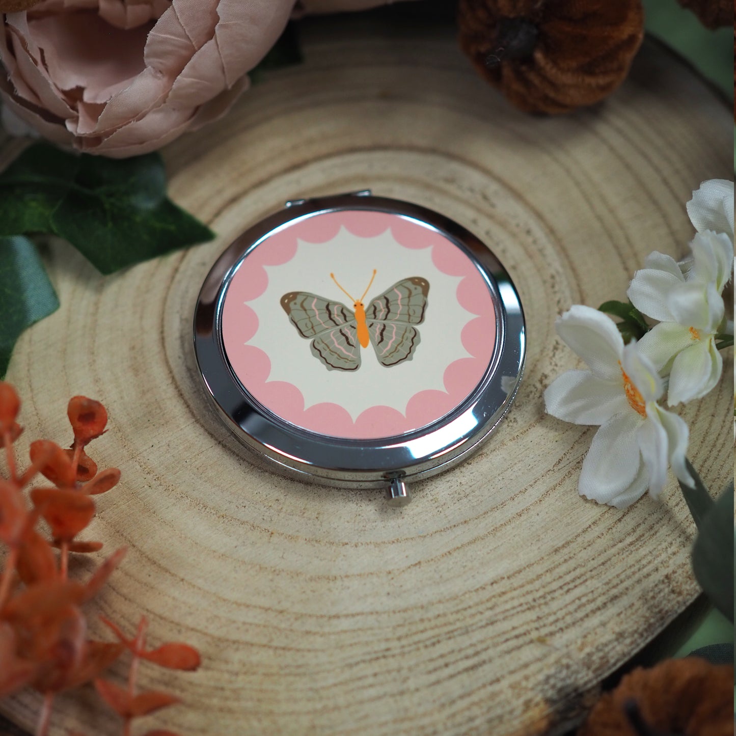 Our little double sided compact mirrors have a clasp close, push peg to open easily and silver finish. One side is a regular mirror and one has magnification for your close ups!