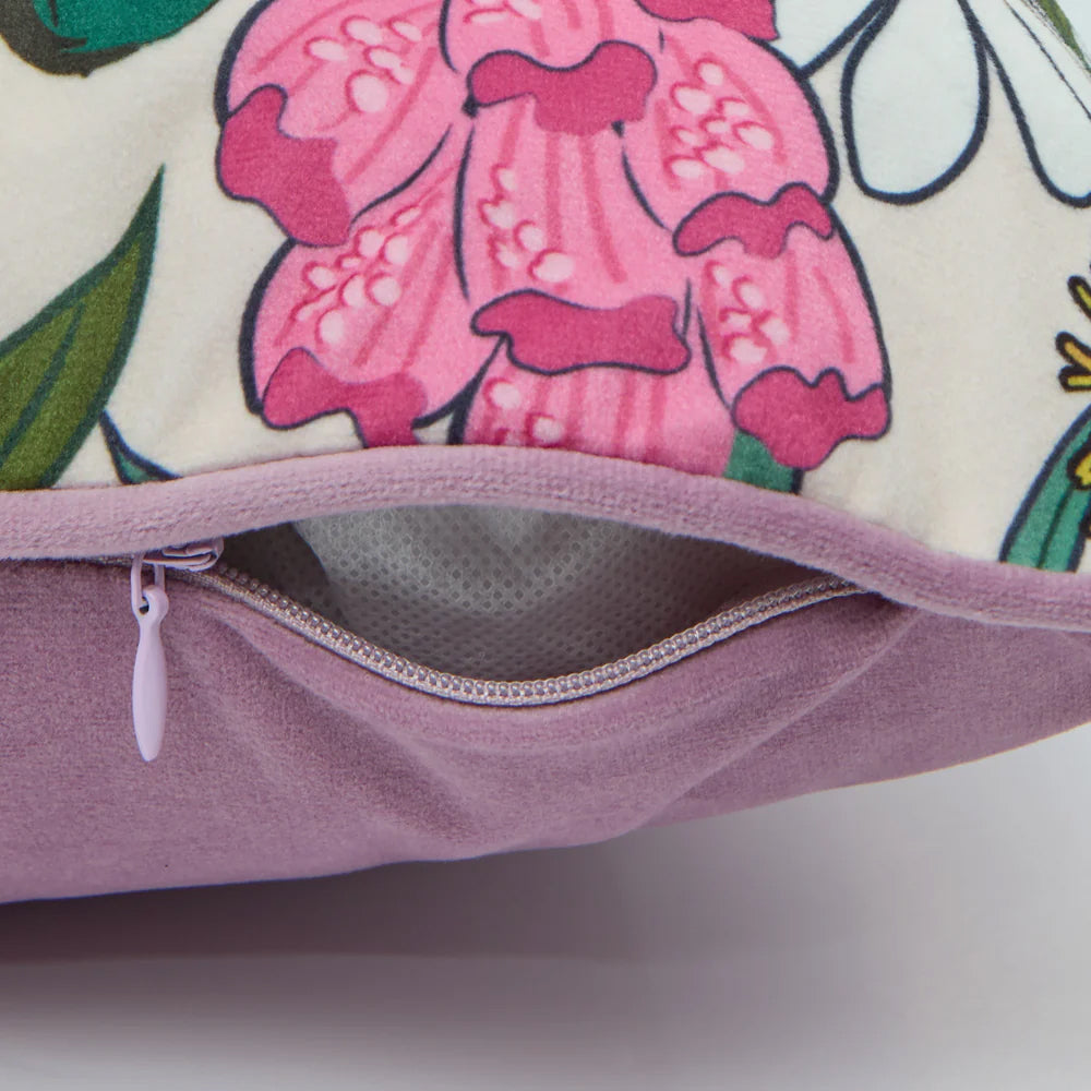 Step into a whimsical wonderland with our Cottage Garden French velvet cushion. Designed in collaboration with the vibrant artist Oh So Daisy, it bursts with dandelions, hydrangeas, foxgloves, and all your fave garden blooms. Flip it over to reveal a complementary lilac back and piping.