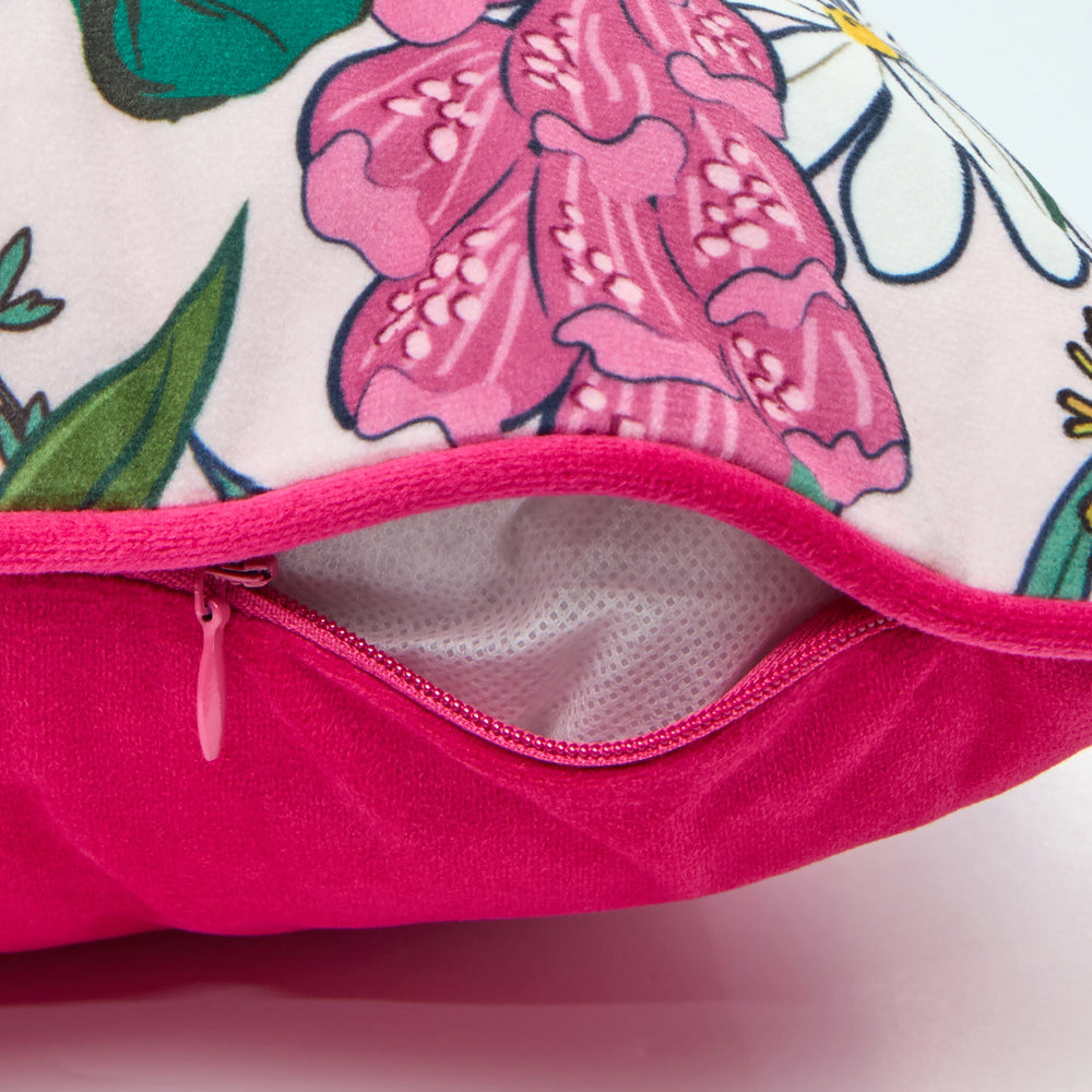 Step into a whimsical wonderland with our Cottage Garden French velvet cushion. Designed in collaboration with the vibrant artist Oh So Daisy, it bursts with dandelions, hydrangeas, foxgloves, and all your fave garden blooms. Flip it over to reveal a complementary rich dark pink back and piping.