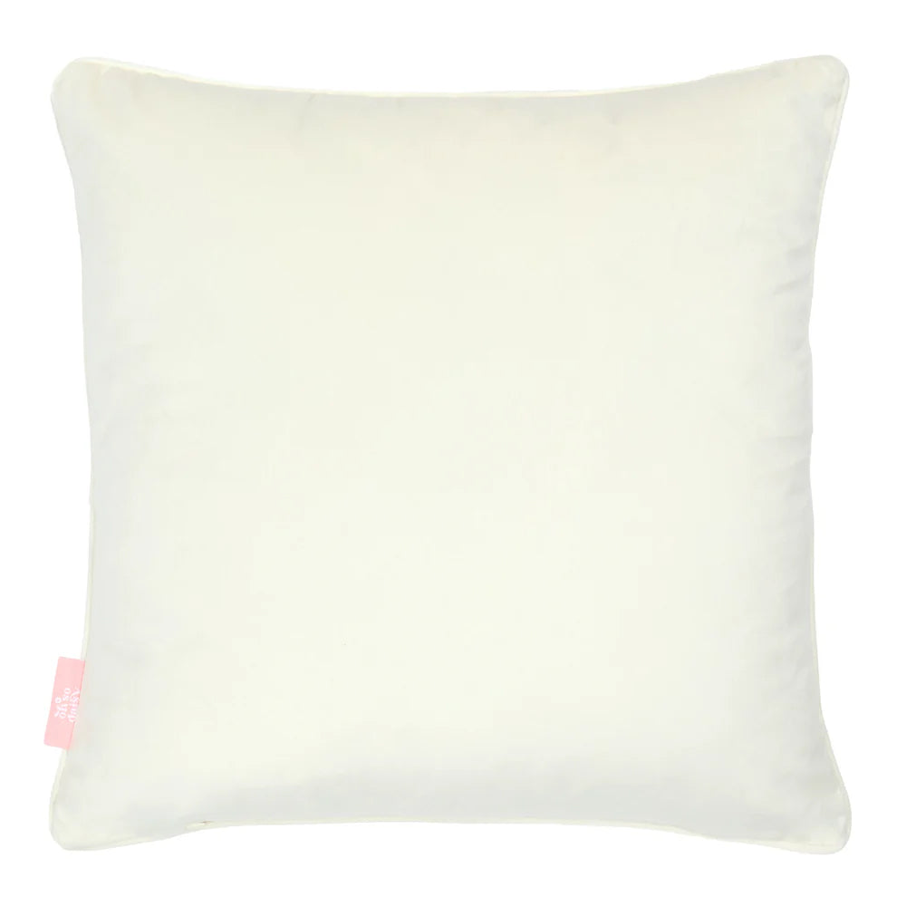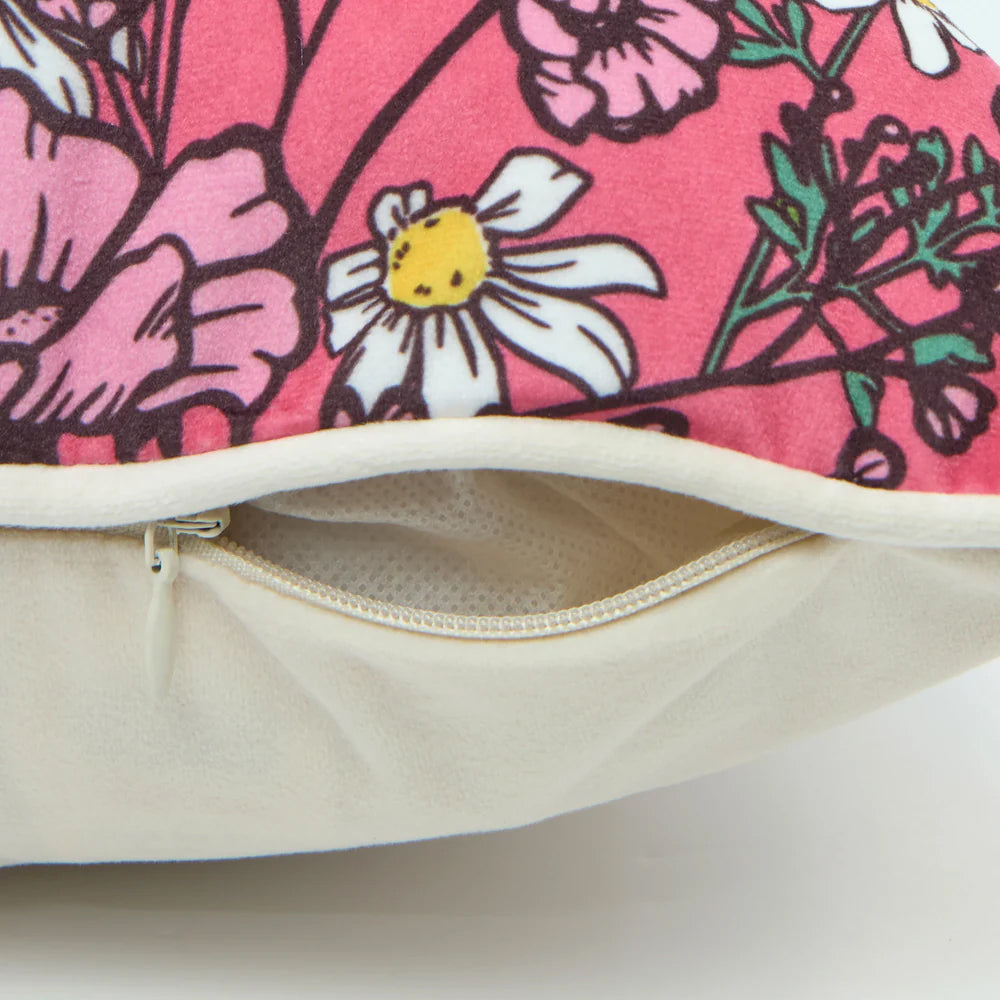 Fill your space with the power of flowers with this eccentric floral French velvet cushion. This design was created for Lust Home by UK designer Oh So Daisy. The multicoloured design on rose pink on the front is complemented by a cream back and piping.