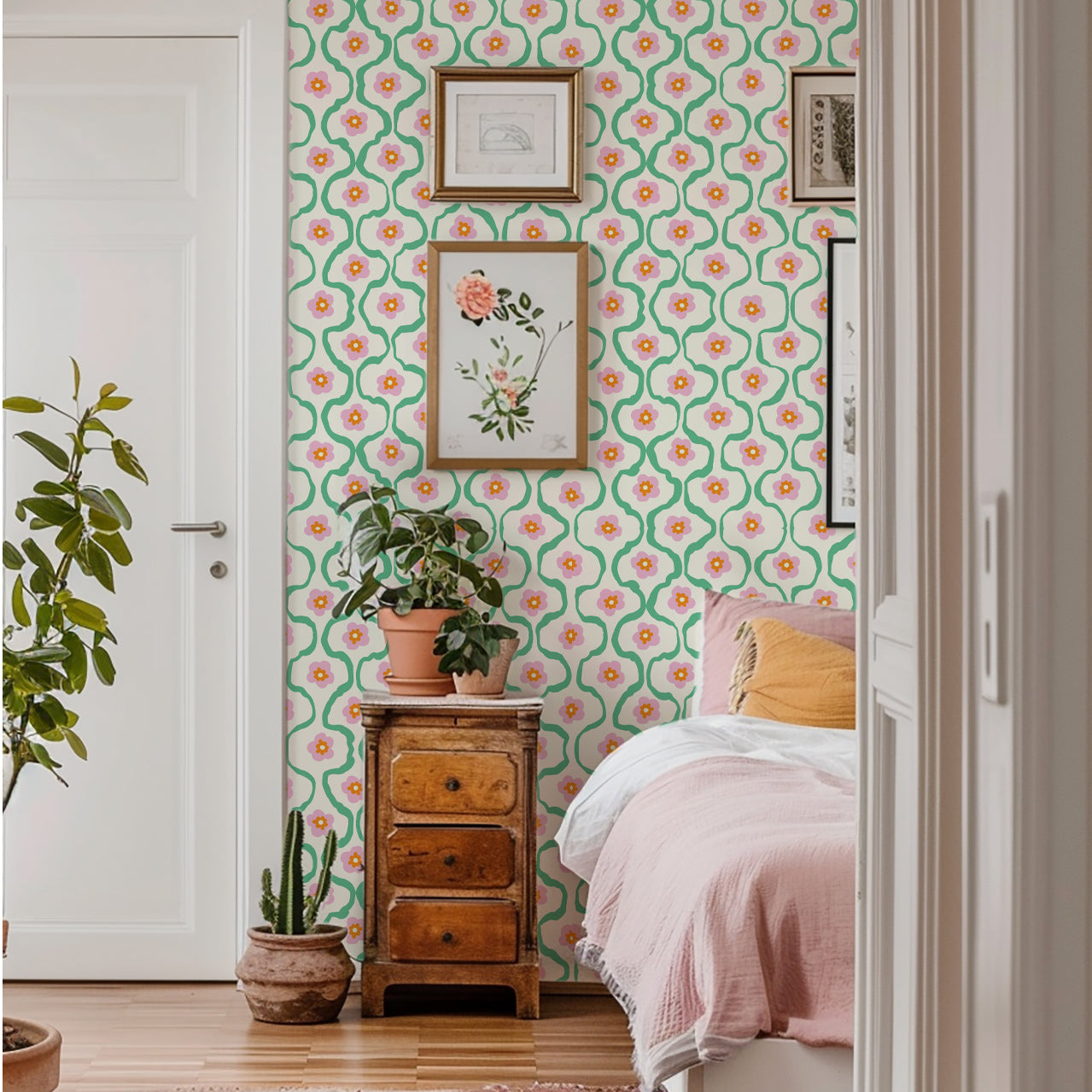 Get a wiggle on! A playful wiggle scallop pattern with dancing hand drawn flowers.