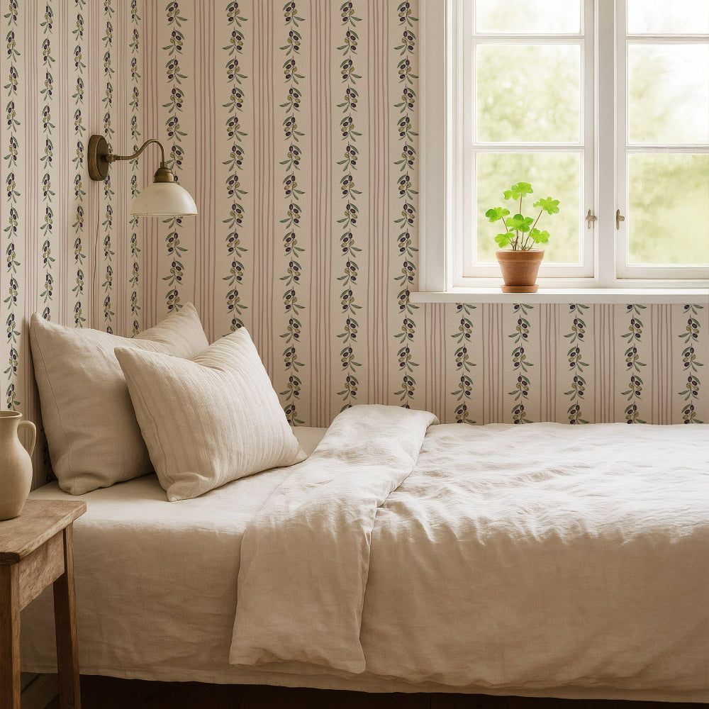 Olive Grove Wallpaper - Let the timeless elegance of “Olive Grove” bring a breath of Mediterranean tranquillity into your home. Inspired by olive groves bathed in golden sunshine along the Croatian coast, this hand-rendered stripe pattern weaves sprigs of olive branches with gentle watercolour strokes.
