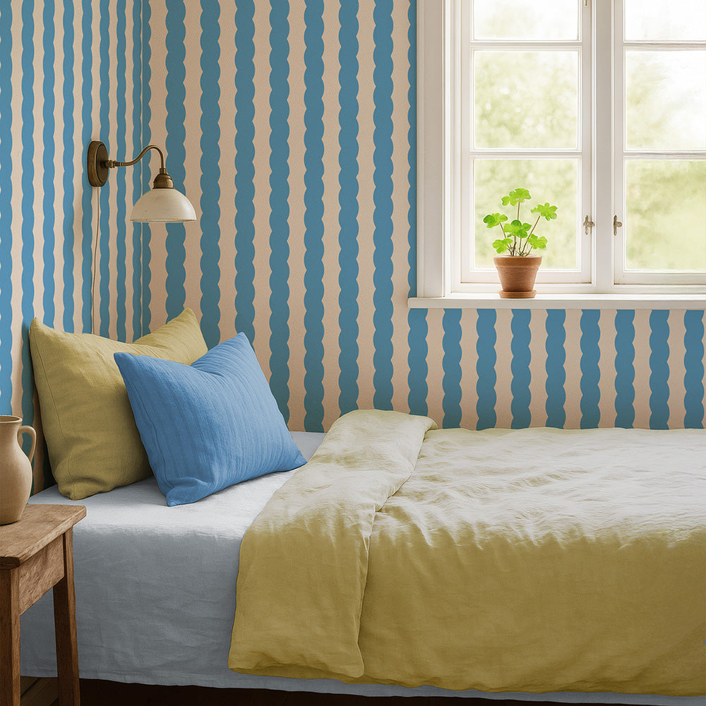 Soft Serve Blue Moon Wiggle Stripe Wallpaper is a playful, modern stripe design inspired by the nostalgic curves of soft-serve ice cream. Featuring gently wavy vertical stripes in a joyful Blue Moon tone. This wallpaper brings energy, warmth, and personality to contemporary interiors.