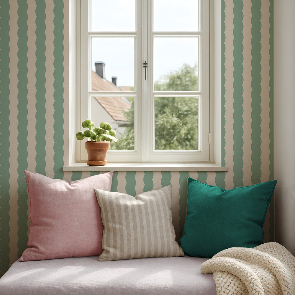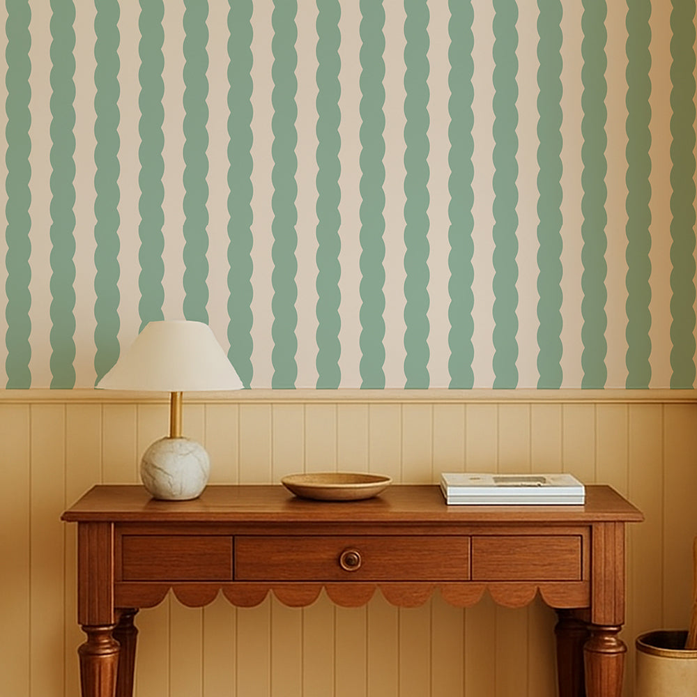Soft Serve Mint Wiggle Stripe Wallpaper is a playful, modern stripe design inspired by the nostalgic curves of soft-serve ice cream. Featuring gently wavy vertical stripes in a joyful Mint tone. This wallpaper brings energy, warmth, and personality to contemporary interiors.