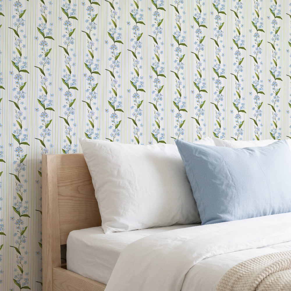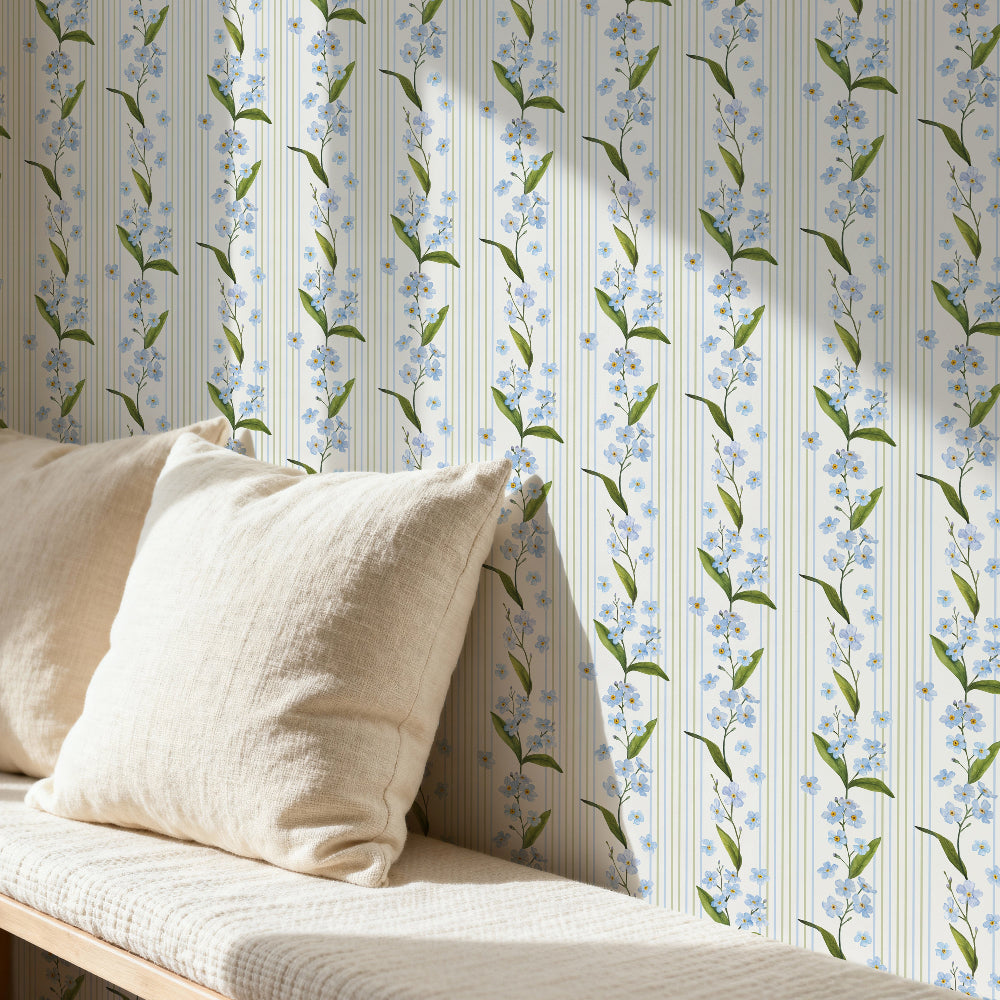 Delicate and quietly romantic, Myosotis Stripe brings together trailing forget-me-not florals and soft stripes for a design that feels both timeless and effortlessly elegant. Inspired by English country gardens and vintage ticking textiles, this print captures the gentle charm of wild blooms gathered in early spring.