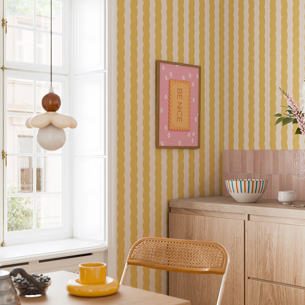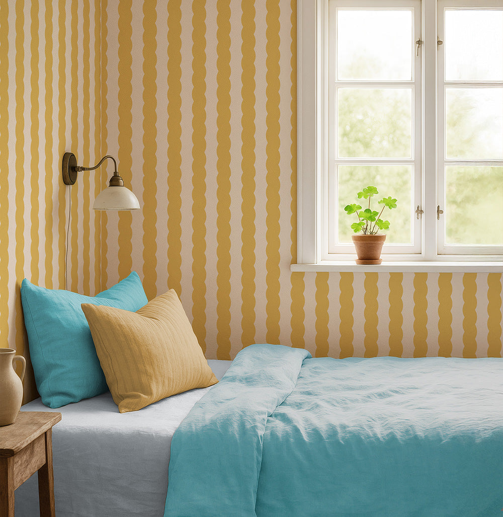 Soft Serve French Vanilla Yellow Wallpaper is a playful, modern stripe design inspired by the nostalgic curves of soft-serve ice cream. Featuring gently wavy vertical stripes in a joyful French Vanilla Yellow tone. This wallpaper brings energy, warmth, and personality to contemporary interiors.