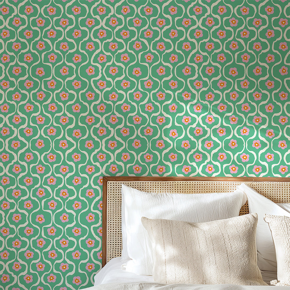 Get a wiggle on! A playful wiggle scallop pattern wallpaper with dancing hand drawn flowers.